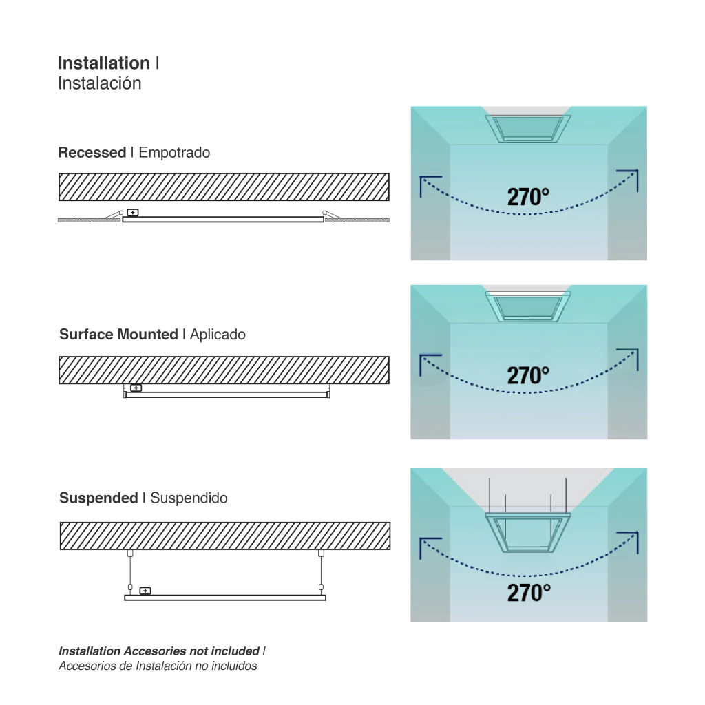 Fácil Instalación: No se necesita ningún accesorio. Éste panel está diseñado para montajes en techos estándares suspendidos, pero también puede ser fácilmente instalado empotrado o suspendido. Su diseño ultra delgado permite una fácil modernización, remodelación o nueva instalación.