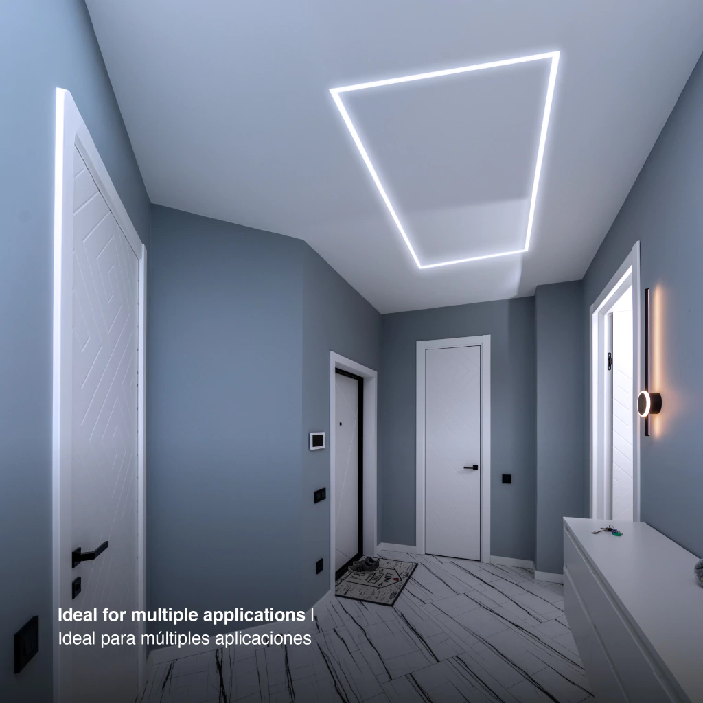 Diversas Aplicaciones: Este marco luminoso es ideal para la iluminación de interiores modernos tales como oficinas, hoteles, y, gracias a su diseño innovador, puede ser usado en espacios industriales e interiores de hogares como en muebles de cocina, armarios y nichos de pared.
