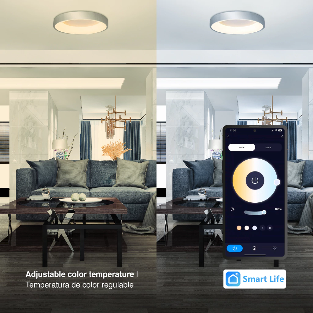 Este modelo permite la regulación tanto del brillo como de la temperatura de color, adaptándose a distintas necesidades y ambientes. Mediante la aplicación Smart Life o control remoto, el usuario puede ajustar la intensidad de la luz en un rango de 0 a 100 % y modificar la temperatura de color entre 3000K y 6000K, lo que permite elegir entre una iluminación cálida, neutra o fría según la preferencia del momento.