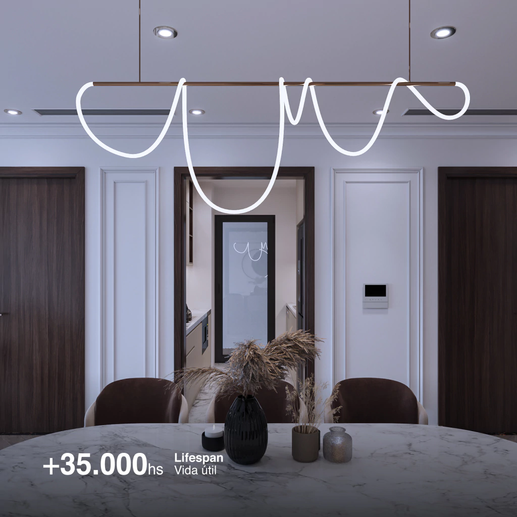 La tira LED es una luminaria flexible con cuerpo cilíndrico de 22 mm de diámetro, diseñada para emitir luz en 360° y generar una iluminación continua y envolvente. Fabricada con un recubrimiento trenzado que le otorga una estética única, esta tira está pensada tanto para aplicaciones decorativas como para montajes comerciales o arquitectónicos que buscan destacar elementos mediante líneas de luz limpias y sin interrupciones.